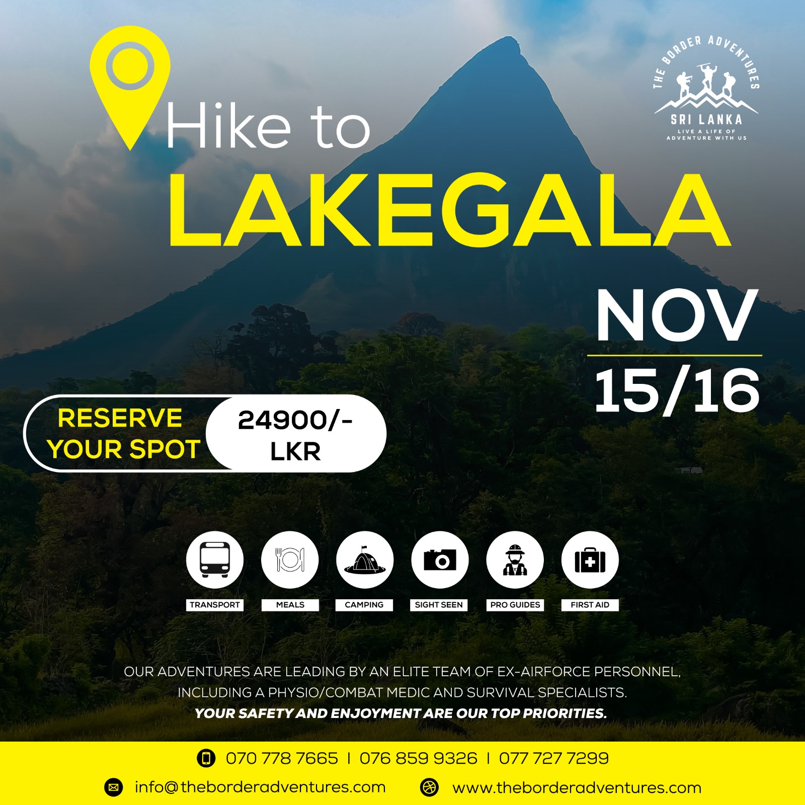 Kalpani Fernando2024-01-30recommendsTrustindex verifies that the original source of the review is Facebook. Stepping to the real-life adventure and jungle experience was a leap out of my comfort zone until I met this amazing team, The Border Adventures From the point when I made the travel inquiry until the end of the whole journey, they made sure I was provided with the right guidance and safety throughout. Also I must mention, being a person with zero knowledge and experience, I would not be able to do this without their guidance and support. They were very concerned on the experience and capacity levels of each of the team member and flexible while supporting us throughout the hike. Special thanks to Lojith Rambukwella, being a great travel mentor and organizing this amazing adventure with experienced guides. Not forgetting Chamika Weerawardena and Malith for taking care of the team throughout the hike ensuring our safety even carrying our bags when it's difficult for us to proceed. I highly recommend them to anyone even with zero experience , especially girls who are afraid but would want to try adventure, The Border Adventures is the right choice for you! Looking forward to join another adventure with them soon!🍃💚⛺️ Agata Lukasik2024-01-09recommendsTrustindex verifies that the original source of the review is Facebook. We did two days hiking in Knuckles Range- on the first day we climbed the five peaks with amazing camping on the top of the second peak! and on the second day we visited Kotaganga waterfalls and were able to swim in one of the natural infinity pools. The Border Adventures is a professional and trustworthy company. they provided the plan in advance, we were able to discuss it. we got all the equipment needed, the guides were well prepared and we had a great time together. we even had the best dinner on the top of the mountain on the first day!!! delicious Pol Roti with lentil dhal. I highly recommend Border Adventures and I am looking forward to going on another trip with them:) Jude Kolitha Silva2023-12-08recommendsTrustindex verifies that the original source of the review is Facebook. The Nuwaragala hike with your team was truly enjoyable. The staff was highly professional and supportive consistently prioritizing the safety of all of us. The Border Adventures comes highly recommended for those seeking memorable adventurous tours. 💚🍃🐘❤️✌️ Dilan Madushanka2023-07-25recommendsTrustindex verifies that the original source of the review is Facebook. my dream mountain has been waiting for me 8 years .it's lakegala .I only see it with my eyes closed but now it's come true thanks to " The border adventures " . your team is the best planned and fully safe team I have ever met in Sri Lanka .Highly recommended❤️ Navneth Mendis2023-07-08recommendsTrustindex verifies that the original source of the review is Facebook. professional, affordable, very helpfull and accommodating Chamika Sanoj2023-06-05recommendsTrustindex verifies that the original source of the review is Facebook. The Border Adventures provided an exceptional hiking experience. Their expertise in managing the risk of Lakegala abseiling was impressive. Great support from their team throughout. Highly recommended❤️ Belinda Gunawardene2023-05-08recommendsTrustindex verifies that the original source of the review is Facebook. Border adventures has the most amazing guides. They are so very professional and care a lot about people’s needs. They didn’t even sleep at night because it started raining while we were camping in our tents and they were worried about if we were getting wet. We went during vesak and they even put lights on the tents we camped in to give us an extra special experience. They gave us protective gear for the dangerous parts of the hike. Really loved the adventure we had climbing Gerandi Ella with this team and the hard work they put into our experience. I fully recommend them and I’m already planning my next adventure with the border adventures. Adrian Gunawardene2023-05-08recommendsTrustindex verifies that the original source of the review is Facebook. We climbed Gerandi Ella with The Border Adventures team, and we all had the BEST time ever! The team was so professional and patient, and they really accommodated ALL of our needs. I can't wait to go on our next adventure with them, and I would recommend them to anyone I know! Ruwanka Hettiarachchi2023-04-16recommendsTrustindex verifies that the original source of the review is Facebook. I was able to fulfill one of my dreams, which was climbing Meemure Lakegala. ❤️ Meemure Lakegala is calling "the dream mountain of every hiker." The owner of The Border Adventures, Mr. Lojith, gave his fullest support to make my dream come true with an unforgettable memory while I was on a very busy schedule 🤗😍 I highly recommend them because of the service they provide to their clients and the resources they have. The team consists of well-trained instructors and a good traveler in SL. 🧗 Therefore, don't think twice about arranging your adventure with The Border Adventures. Recommending for any kind of Adventure.🚣🏊⛰️🧗⛺🇱🇰🎉️ Lauraine Quix2021-12-12recommendsTrustindex verifies that the original source of the review is Facebook. Wat een ontzettend gaaf avontuur op een adembenemend mooie locatie! De mannen geven je direct een vertrouwd gevoel, en weten waar ze het over hebben. Kortom, ben je in de buurt? Ga hier naartoe!